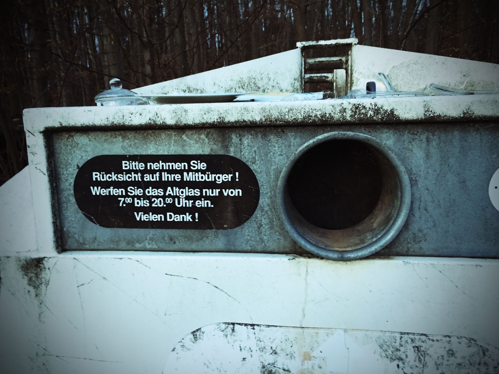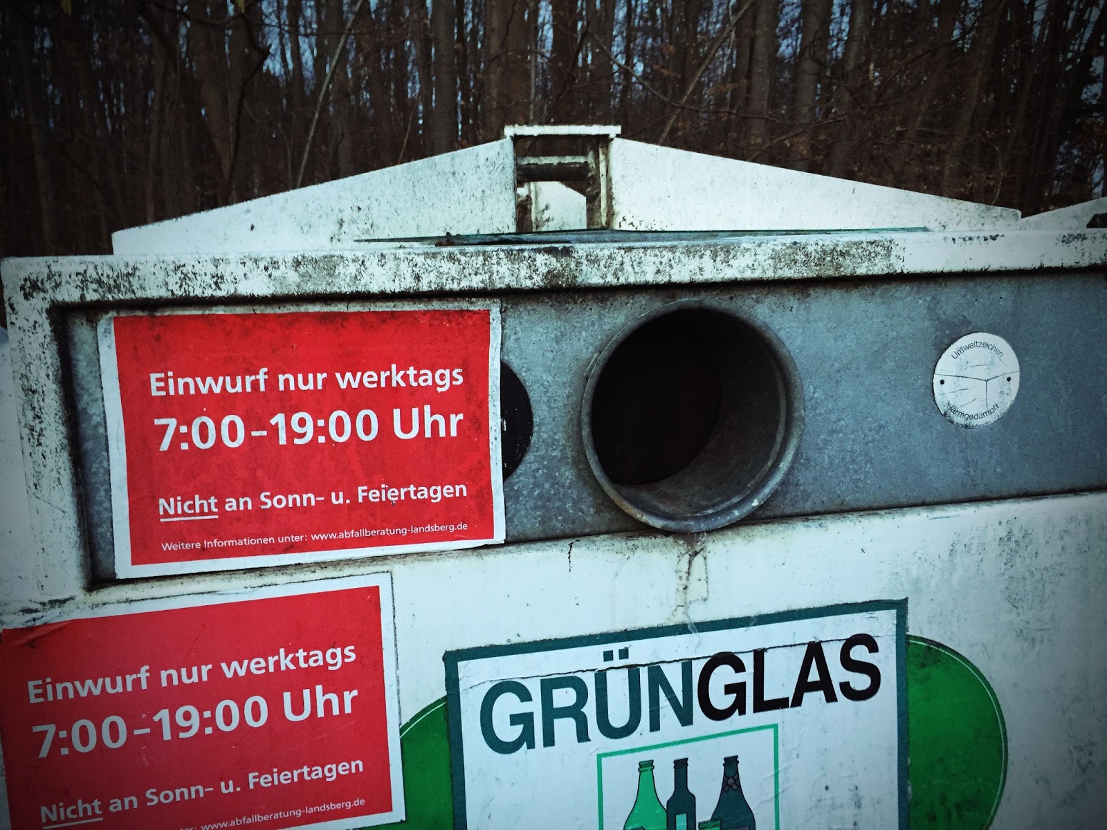Das Schild auf dem Container ist eindeutig: Einwurf von Altglas nur werktags, und spätestens um 19:00 Uhr ist Schluss. Schon klar, die Anwohner wollen irgendwann ihre Ruhe haben.