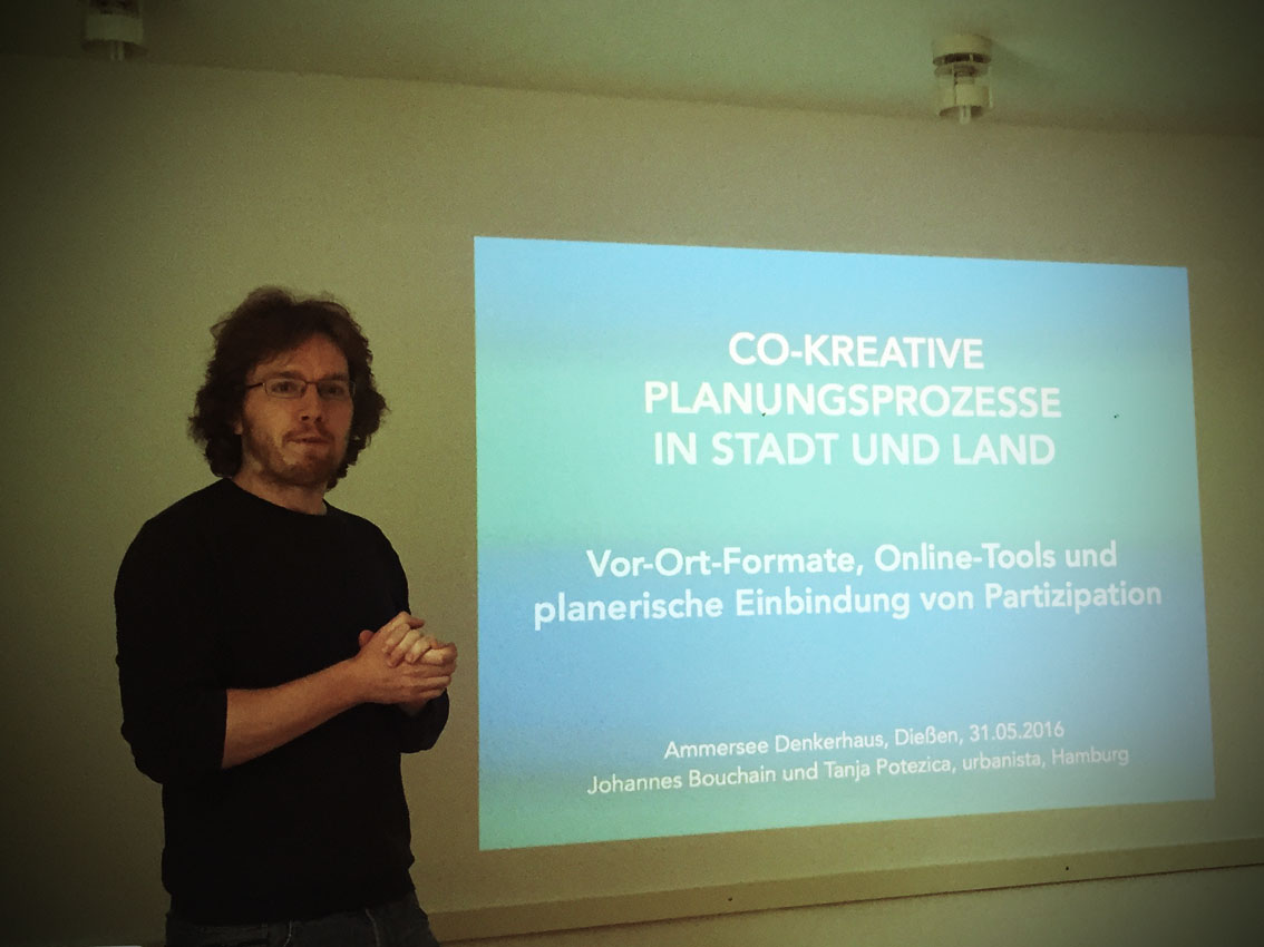 Bouchain und Potezica betonten dabei die Wichtigkeit, Bürger über verschiedenste Wege zur Mitarbeit zu animieren. Mir war Urbanista vor allem als Erfinder der „Next“ Onlineplattform bekannt (die auch für www.mein-ammersee-2020.de verwendet wird). Trotzdem sehen sie in der Online-Beteiligung kein Allheilmittel, sondern einen von vielen Wegen, um die Bürger zu erreichen.