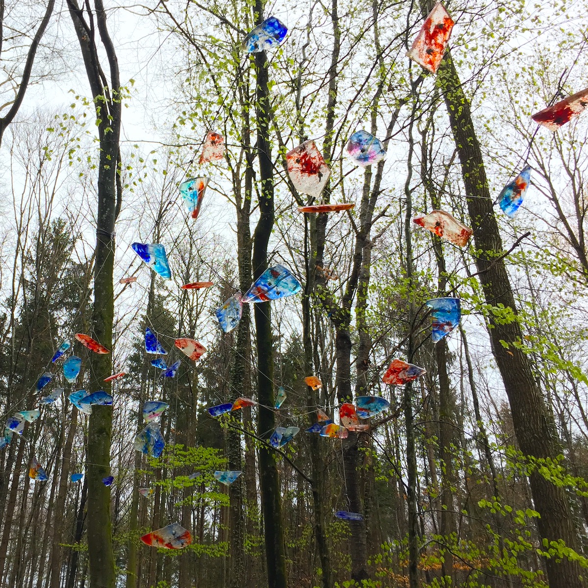 Die zwischen den Bäumen aufgespannten farbigen Gläser entfalten zu jeder Tages- und Jahreszeit eine eigene Wirkung. Im bunten Herbstlaub sind sie fast unauffällig, vor einem grauen Winterhimmel dafür um so leuchtender. Im Sommer schweben sie vor dem Hintergrund tiefgrüner Blätter, im Frühjahr könnte man sie für die Blüten exotischer Pflanzen halten.