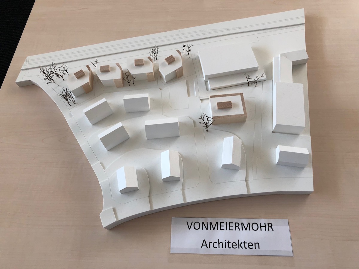 Mir wurde bei dieser Gelegenheit wieder einmal klar, dass ich eben kein Architekt oder Baufachmann bin. Die Modelle und Pläne sahen für mich hübsch aus, aber große Unterschiede konnte ich nicht erkennen. Das liegt natürlich auch daran, dass der Bebauungsplan die Möglichkeiten ziemlich eng vorgegeben hatte. Fast alle Entwürfe sahen entlang der Bahnlinie einen langen Wohnblock vor (den sogenannten „Aal“), mal als gerade Zeile, mal geschwungen und mal abgewinkelt. Im Westen hinter dieser bewohnten Lärmschutzmauer hatten die Planer Einzel- und Doppelhäuser platziert. Neben der neuen (noch zu bauenden) Turnhalle am Südende gibt es einen größeren Wohnblock, der als Mehr-Generationen-Haus mit Gemeinschaftsräumen genutzt werden kann. Die Zufahrt zum Gelände und zur Tiefgarage erfolgt von der Schulstraße aus. Das wird wegen dem Verkehrsaufkommen sicher problematisch, ist aber nicht anders zu lösen, solange man die Siedlung nicht über eine Luftbrücke erschließt. Hier sind ein paar Photos von der Präsentation im Rathaus, damit ihr euch selbst ein Bild machen könnt, was gebaut werden hätte können. Vielleicht kann mir ein Fachmann die wesentlichen Unterschiede der Konzepte erklären?